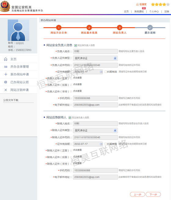 二、主体负责人信息录入后添加网站